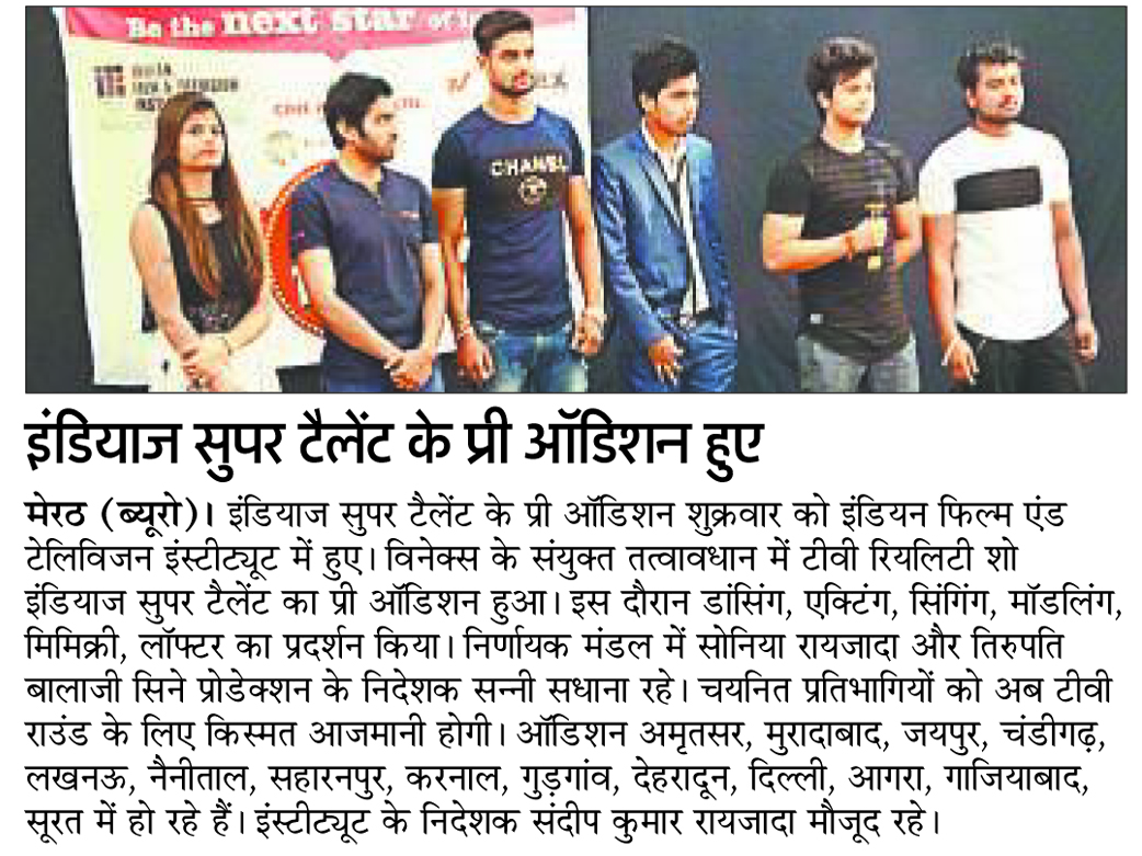 The auditions for TV Reality Show “India’s Super Talent” was organised by IFTI, Vinex, Bravura Gold Resort, Cine Acts Pvt. Ltd.  in collaboration with White Feather Films Ltd. on 14th April, 2017.  Let’s see what speaks Media (Dainik Jagran & Amar Ujala) about this awesome event. Thanks Media for covering this news.